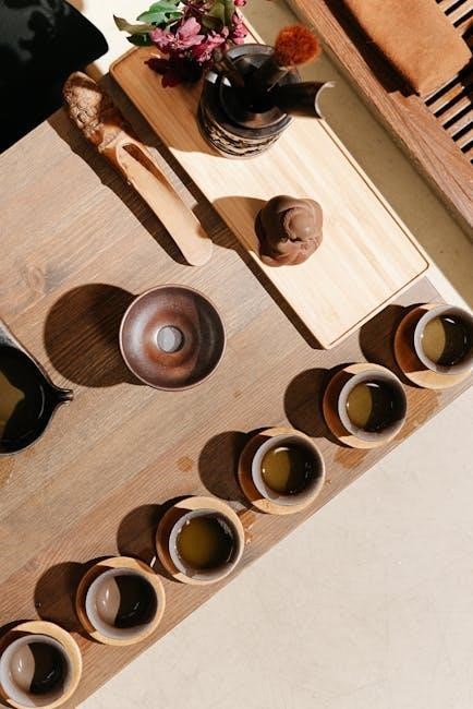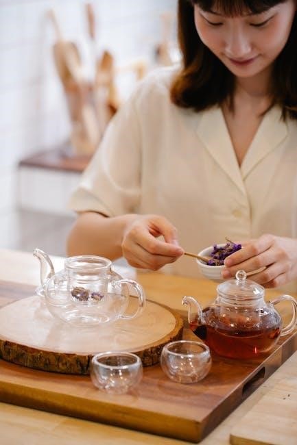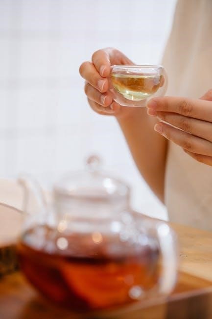 Water is the foundation of tea brewing, as it directly impacts the flavor and aroma of the tea; Fresh, clean water is essential to prevent any impurities or odors from altering the taste. Using filtered or spring water is recommended, as tap water may contain minerals or chemicals that can affect the tea’s quality. Hard water, for instance, can accentuate bitterness, while soft water may result in a flatter taste. Ideally, water should be free from chlorine and heavy metals to ensure a pure extraction of the tea’s natural flavors. Additionally, the temperature of the water must align with the type of tea being brewed, as this affects how the leaves unfurl and release their compounds. Thus, understanding and selecting the right water is a cornerstone of mastering the art of tea brewing.